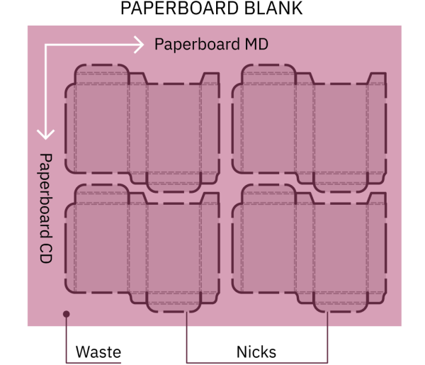 The principle of die cutting can be illustrated with a packaging application. When outer profiles are die cut, the cut blanks remain attached to the skeleton by nicks. To prevent unwanted separation of the sheet during its transfer to subsequent stations, the nicks must be strong enough to hold together. At the same time they must be weak enough to be easily separated in the stripping operation, in which the paperboard waste is removed.