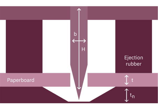 The rubbers for such an area serve only to eject the sheet after it has been die cut. The most important paperboard property in this context is good elasticity. The rubber should be compressible to at least 50% of its normal height.