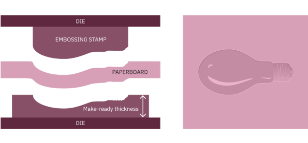 To create the relief, the stamp pushes the paperboard into the groove of the make-ready.