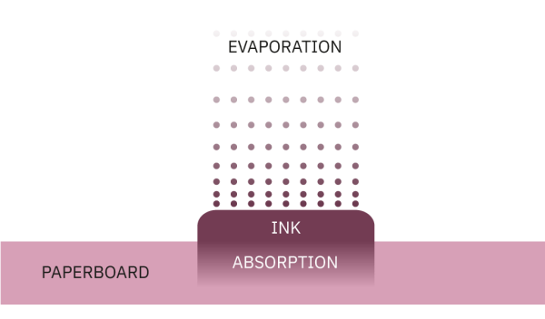 The fibres, paperboard treatments, and coating composition are features which, to a high degree, determine the absorption properties of the paperboard. The composition of inks and varnishes also has an impact on absorption and drying.