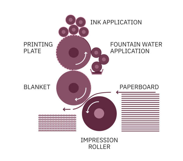 Offset lithography is a method – or rather a set of methods – often used to print paperboard. It provides very high print quality and is commercially attractive for a wide range of run lengths. The printing process involves a complex interaction between the ink, fountain solution in wet offset, blanket, paperboard characteristics, and drying mechanisms, together with the pressure, temperature, and press speed.