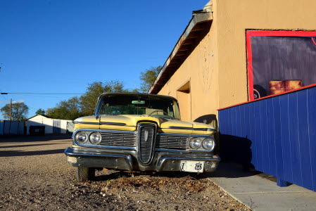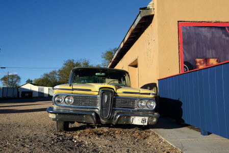 This is a picture of a Ford Edsel in Seligman, a little town along Route 66. The image is in RGB and has some colourful details.