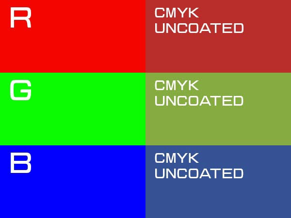 This is a comparison, in RGB, of how Red, Green and Blue would look like if printed on uncoated paper with offset printing. When a colour is converted from RGB to CMYK it is adopted to a much smaller colour space, meaning that the available nuances will be limited. In one way or another this will affect the image that you want to print. Let’s have a closer look at what will happen.