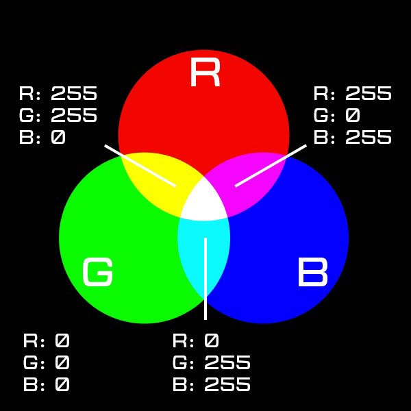 RGB is a colour system based on the colours that your eyes can pick up. RGB stands for Red, Green and Blue, each colour is referred to as a channel. Each channel has a value scale ranging from 0 to 255. A higher number means that more light of a certain channel is added, a lower value means less light and a darker colour. This is called an additive colour model. When creating something on a computer, the screen will show you the colours in RGB. There are different versions of RGB, called profiles, but for now we will just call it RGB.