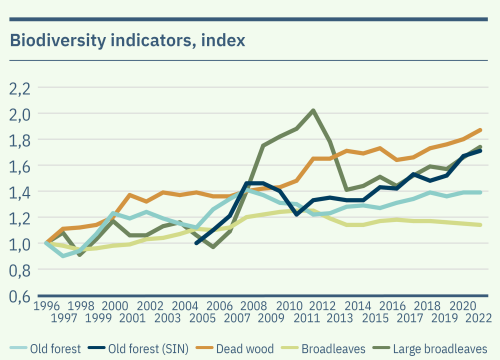 Forest biodiversity is affected by multiple factors. Holmen monitors developments annually through five biodiversity indicators that show how these forest habitats are developing: