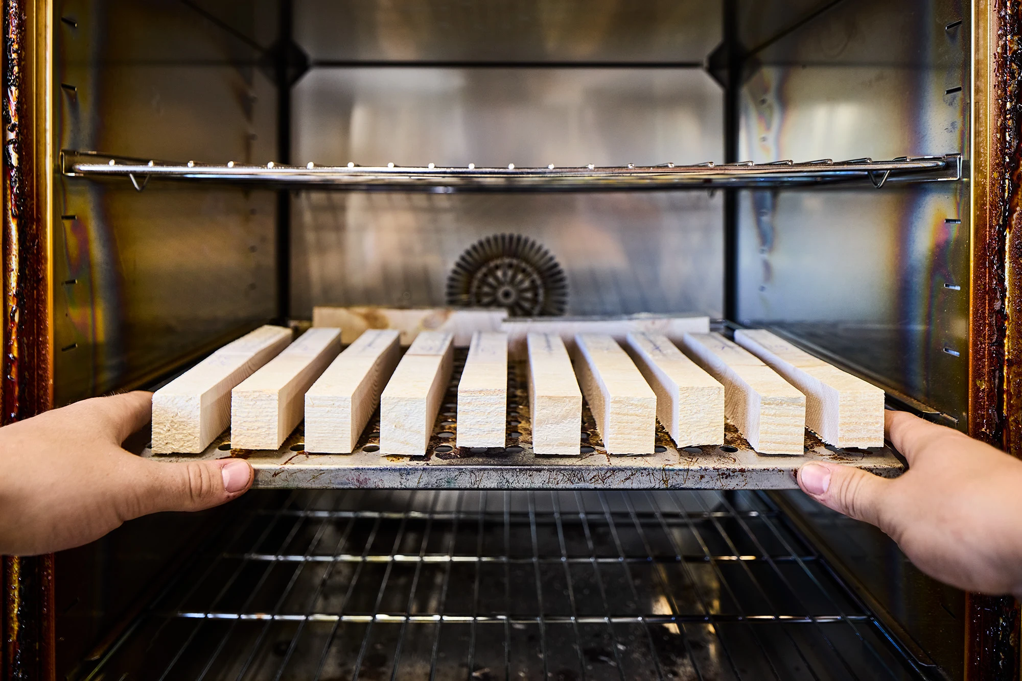 Ju lägre fuktkvot desto svårare är det att träffa rätt i torkningsprocessen. I torklabbet finns tre ugnar och det går att göra max nio torrviktsprov samtidigt. Träbitarna står i ugnen i fyra till sex timmar i 140 graders värme.